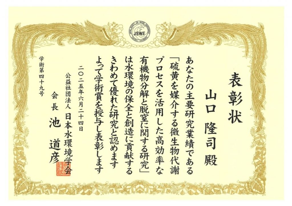 山口隆司教授が、日本水環境学会2024年度学術賞を受賞しました。